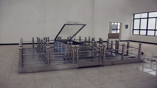 優(yōu)質(zhì)不銹鋼雙層圍欄,內(nèi)設不銹鋼平臺,綠色草坪,特制液壓升降式透明高罩